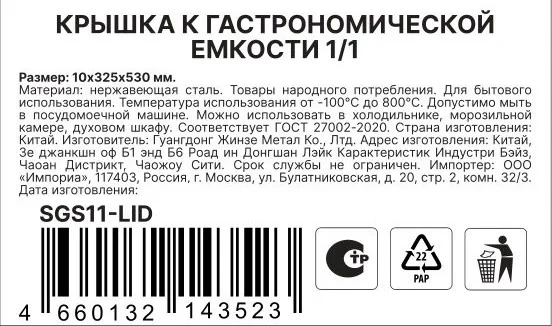 Крышка для гастроемкости нержавеющая сталь 1/1