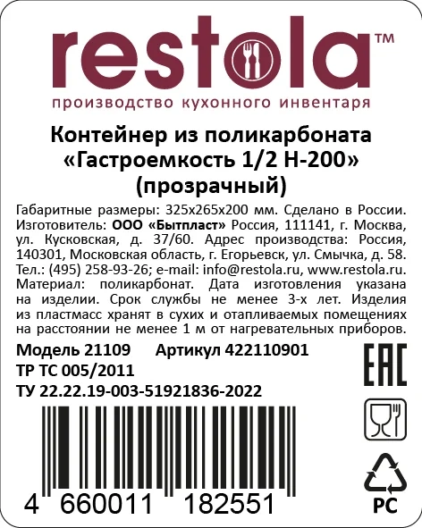 Гастроемкость Restola поликарбонат 1/6 65мм, 1л