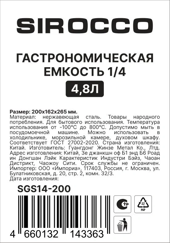 Гастроемкость нержавеющая сталь 1/4 200мм, 4.8л