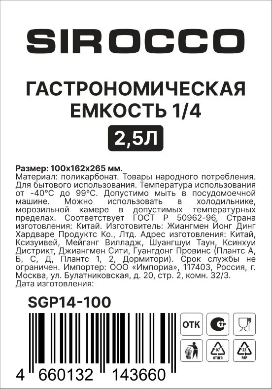 Гастроемкость поликарбонат 1/4 100мм, 2.5л