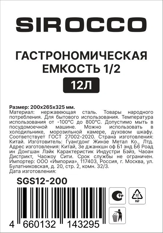 Гастроемкость нержавеющая сталь 1/2 200мм, 12л