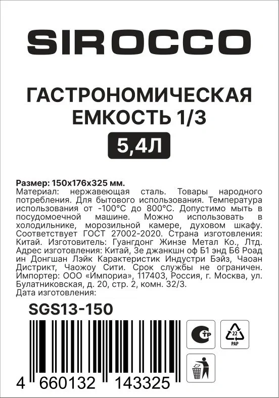 Гастроемкость нержавеющая сталь 1/3 150мм, 5.4л