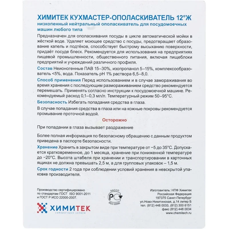 Концентрированный ополаскиватель Химитек Кухмастер-Ополаскиватель 12°Ж 5л, для ПММ любого типа