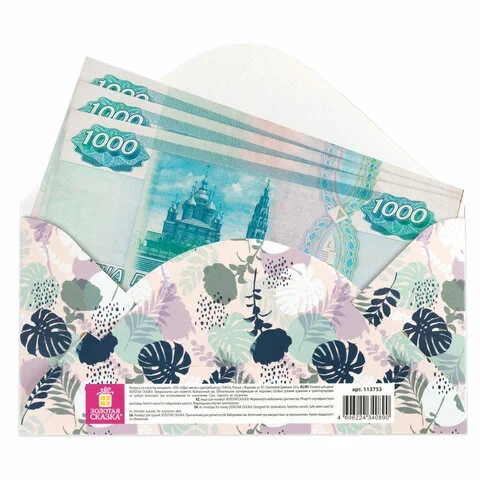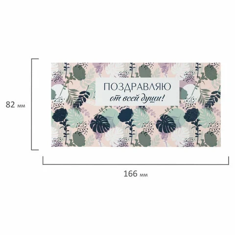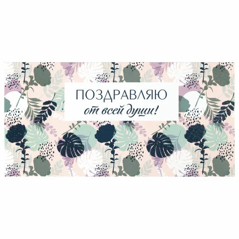 Конверт с цветочным принтом и надписью 'ПОЗДРАВЛЯЮ ОТ ВСЕЙ ДУШИ!' изготовлен из высококачественного картона плотностью 215 г/м2. Отделка - блестки. Размер - 166х82 мм.