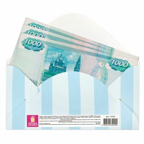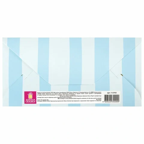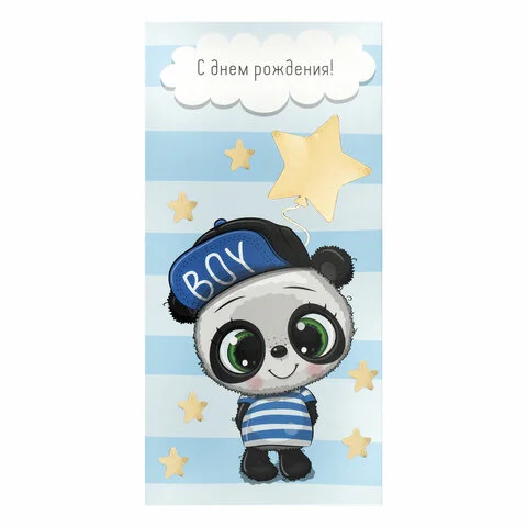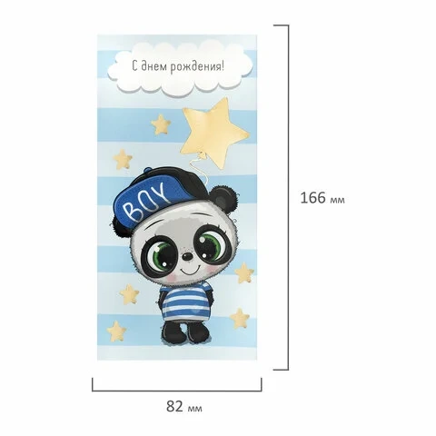 Конверт с надписью 'С ДНЁМ РОЖДЕНИЯ!' изготовлен из высококачественного картона плотностью 215 г/м2. Выполнен в голубых оттенках с изображением панды-мальчика. Отделка - фольга. Размер - 166х82 мм.