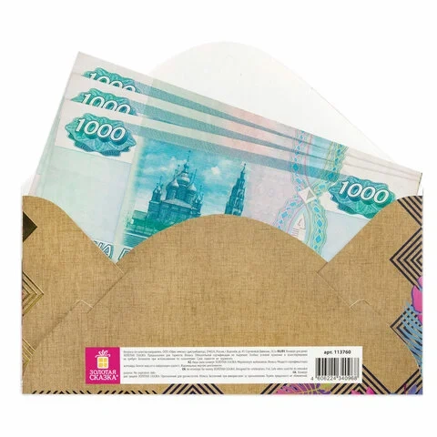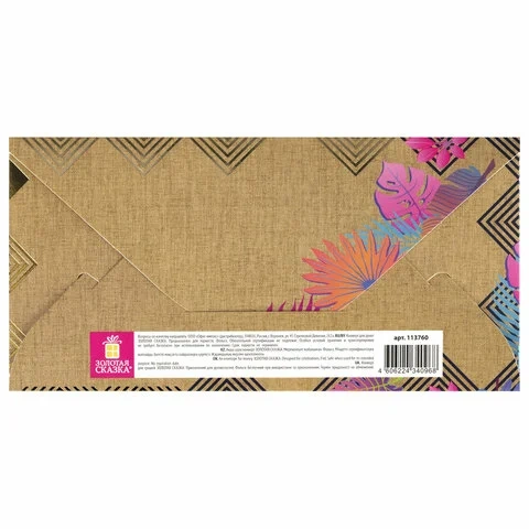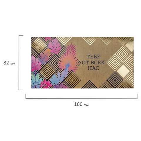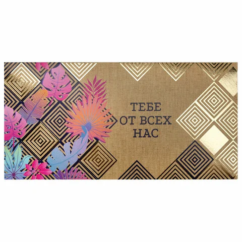Конверт с надписью 'ТЕБЕ ОТ ВСЕХ НАС' изготовлен из высококачественного картона плотностью 215 г/м2. Выполнен в бежевом цвете с абстрактным принтом. Отделка - фольга. Размер - 166х82 мм.