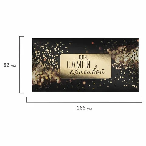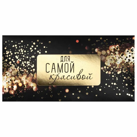 Конверт с надписью 'ДЛЯ САМОЙ КРАСИВОЙ' изготовлен из высококачественного картона плотностью 215 г/м2. Выполнен в темных оттенках с золотистым принтом. Отделка - фольга. Размер - 166х82 мм.