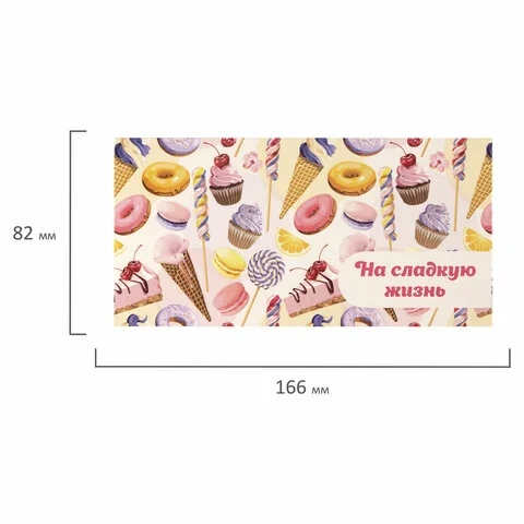 Конверт с надписью 'НА СЛАДКУЮ ЖИЗНЬ!' изготовлен из высококачественного картона плотностью 215 г/м2. Выполнен в светлых тонах с изображением сладостей. Отделка - блестки. Размер - 166х82 мм.