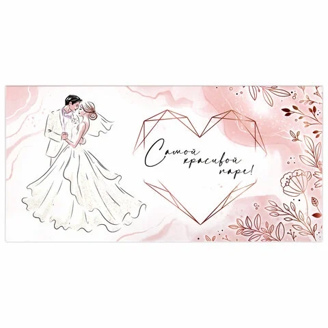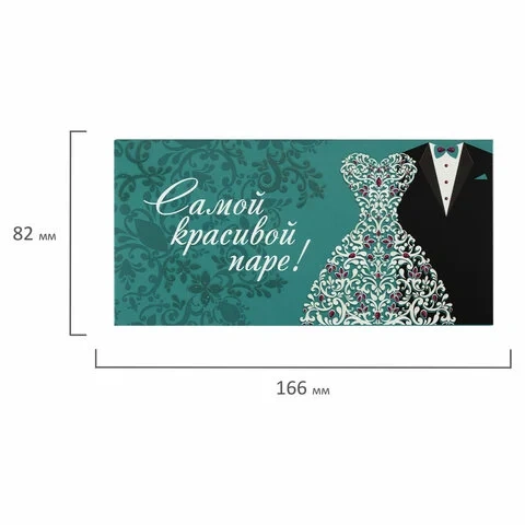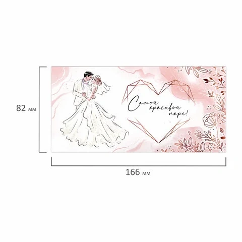 Конверт с тематическим свадебным принтом и надписью 'САМОЙ КРАСИВОЙ ПАРЕ!' изготовлен из высококачественного картона плотностью 215 г/м2. Отделка - блестки. Размер – 166х82 мм.