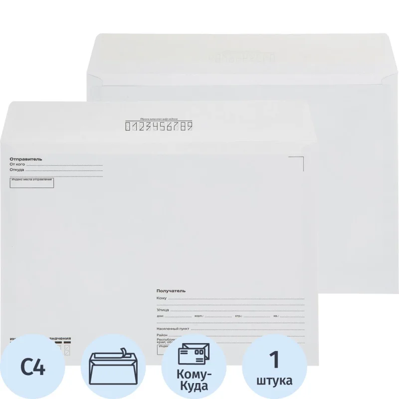 Конверт Куда-Кому С4 стрип Attache Economy 90 гр 229х324 250шт/уп Конверт почтовый формата С4 размером 229x324 мм, с подсказом 'Кому-Куда' с отрывной лентой (стрип). Предназначен для упаковки документов формата А4 без сгибания. Товар относится к ценовому сегменту 'бюджет'. Имеет базовые характеристики и более простую упаковку. Отвечает основным требованиям потребления.