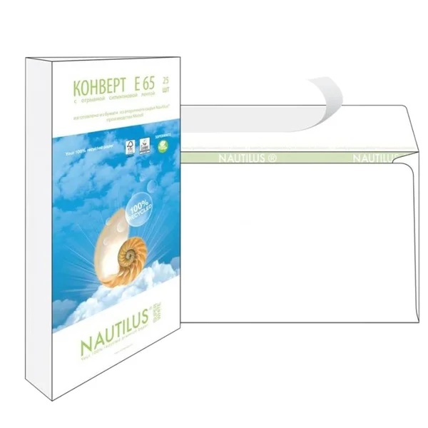 Конверт Е65 без окна, зеленая внутренняя запечатка с логотипом Nautilus.