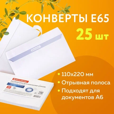 Конверт почтовый Brauberg Е65 белый, 110х220мм, 80г/м2, 25шт, стрип