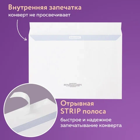 В конверт формата C4 можно вложить документ формата А4. На передней стороне конверта имеются адресные указатели: 'Куда', 'Кому', 'От кого', 'Откуда'. Плотность бумаги 100 г/м2 позволяет размещать тяжелую корреспонденцию, а внутренняя запечатка поможет скрыть содержимое от посторонних глаз. Отрывная полоса типа STRIP обеспечивает надежное запечатывание конверта и сохранность личного письма или важного документа.