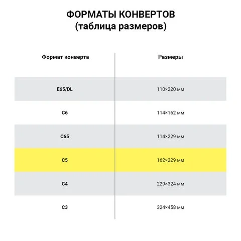 В конверт формата C5 можно вложить документ формата А4, сложенный пополам. Плотность бумаги 80 г/м2 позволяет размещать тяжелую корреспонденцию, а внутренняя запечатка поможет скрыть содержимое от посторонних глаз. Отрывная полоса типа STRIP обеспечивает надежное запечатывание конверта и сохранность личного письма или важного документа.
