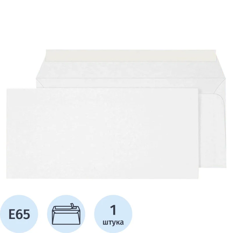 Конверт Ecopost E65 80 г/кв.м белый стрип (1000 штук в упаковке) 110×220 мм, выполнен из офсета 80 г/кв.м, 100% белизны, без внутренней запечатки, имеет клеевое нанесение типа стрип (отрывная силиконовая лента). Ширина клапана — 10 мм. Предназначены для пересылки 6 листов А4 формата сложенных втрое, что равно 30 г веса. Не рекомендован для нанесения офсетной печати.