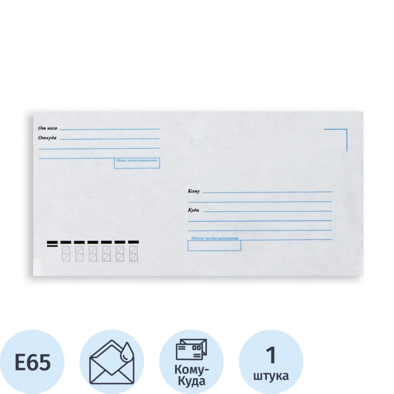 Конверт ForPost Е65 80 г/кв.м Куда-Кому белый декстрин с внутренней запечаткой (1000 штук в упаковке) 110×220 мм выполнен из офсета 80 г/кв.м, имеет клеевое нанесение типа декстрин (смачиваемый или водорастворимый клей) и почтовый подсказ ’Куда-Кому’. Предназначены для пересылки 6 листов А4 формата сложенных втрое, что равно 30 г веса. Упакован в короба по 1000 штук. Срок годности 1 год по ГОСТ. Показатель белизны бумаги — 143-149 %.
