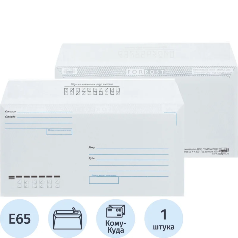 Конверт ForPost Е65 80 г/кв.м Куда-Кому белый стрип с внутренней запечаткой (1000 штук в упаковке) 110×220 мм выполнен из офсета 80 г/кв.м, имеет клеевое нанесение типа стрип (отрывная силиконовая лента) и почтовый подсказ ’Куда-Кому’. Предназначены для пересылки 6 листов А4 формата сложенных втрое, что равно 30 г веса. Упакован в короба по 1000 штук. Срок годности 1 год по ГОСТ. Показатель белизны бумаги — 143-149 %.