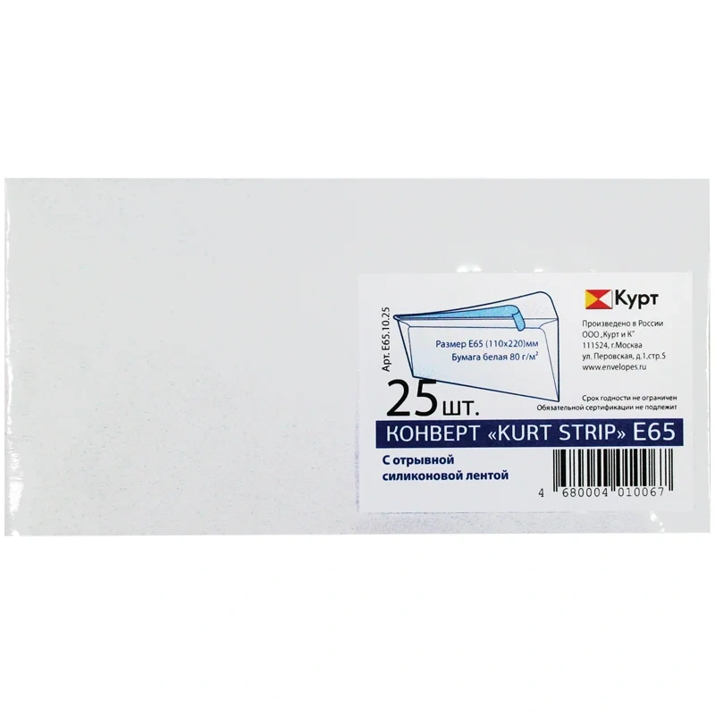 Конверт почтовый Курт Е65 белый, 110х220мм, 80г/м2, 25шт, стрип