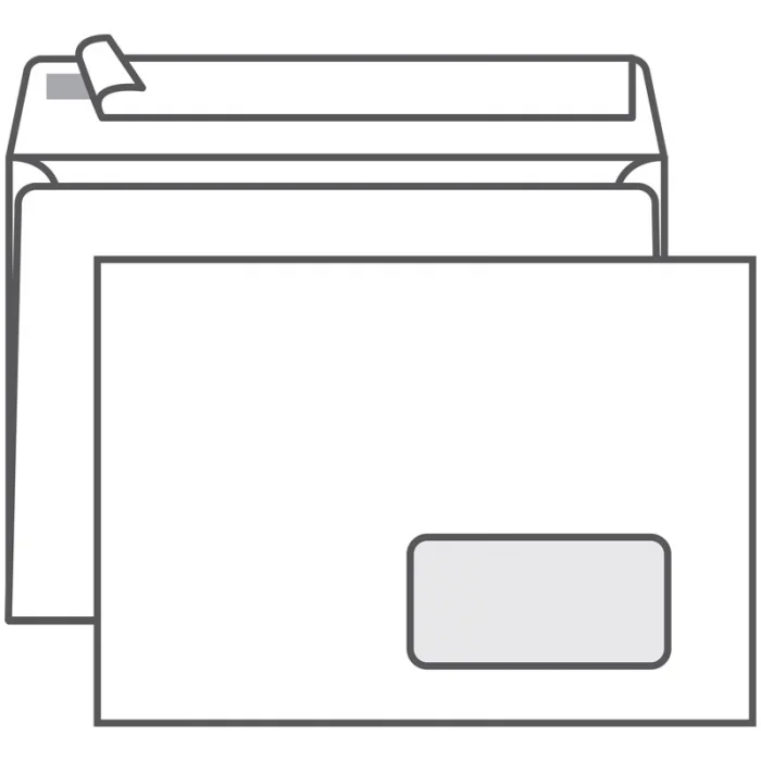 Конверт без подсказа имеет горизонтальное окно справа. Формат С5 соответвует размеру 162х229мм. Служит для рассылки документов А5 без сложения и А4, сложенных вдвое. Клапан конверта крепится с помощью отрывной силиконовой ленты