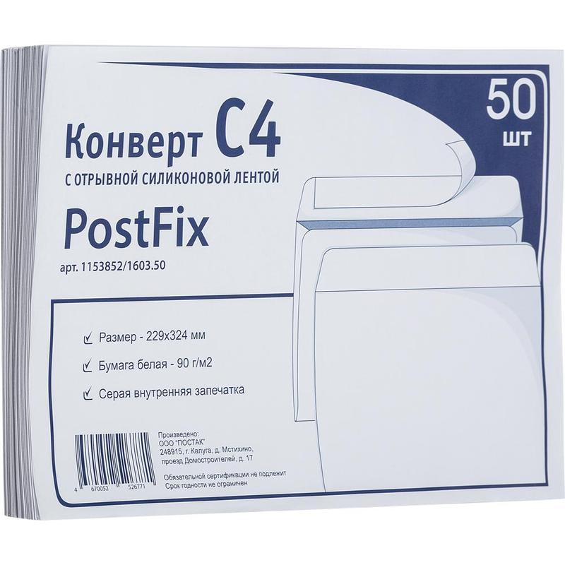 Конверт Postfix C4 (соответствует формату бумаги А4) 229?324 мм выполнен из офсета 90 г/кв.м, имеет клеевое нанесение типа стрип (отрывная силиконовая лента). Предназначен для отправлений различной документации, писем и т.п. Упаковка 50 штук. Срок годности не ограничен.