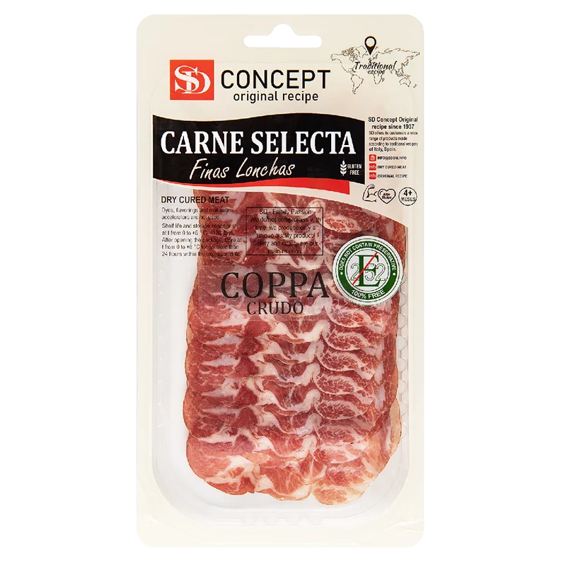 Это знаменитый итальянский деликатес. В процессе приготовления отборное мясо маринуем в натуральных специях и пряностях, бережно собранных на разных континентах, натираем морской солью, заворачиваем в натуральную оболочку и вывешиваем для созревания. Готовый продукт имеет цилиндрическую форму, а ярко-красный цвет и мраморно-белые прожилки на срезе создают поистине завораживающее зрелище. Она ценится за её тонкий мясной аромат, нежную текстуру и незабываемый яркий вкус. Коппу нарезают тонкими ломтиками и едят как самостоятельную закуску в сочетании с сыром, свежими овощами и зеленью. Из напитков выбор лучше остановитьнабеломвине. Для приготовления коппы - знаменитого итальянского деликатеса, отборная свинина маринуется в натуральных специях и пряностях, бережно собранных на разных континентах, натирается морской солью, заворачивается в натуральную оболочку и вывешивается для созревания. Готовый продукт имеет цилиндрическую форму, а ярко-красный цвет и мраморно-белые прожилки на срезе создают поистине завораживающее зрелище. Коппа ценится за её тонкий мясной аромат, нежную текстуру и незабываемый яркий вкус. Её нарезают тонкими ломтиками и едят как самостоятельную закуску в сочетании с сыром, свежими овощами и зеленью.