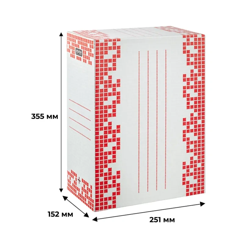 Ширина корешка составляет 150 мм. Короб вмещает 1500 листов стандартной плотности. Внешний размер: 251×152×355 мм. Внутренний размер: 242×145×340 мм.