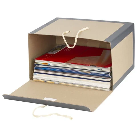 Изготовлен из переплетного картона толщиной 1,25 мм с покрытием из бумвинила. Имеет поля для записей на лицевой стороне. Вмещает до 1700 листов. Выдерживает до 15 кг. Размер короба - 33x18x24 см. Имеет откидную крышку и 2 хлопчатобумажные завязки. Поставляется в разобранном виде.