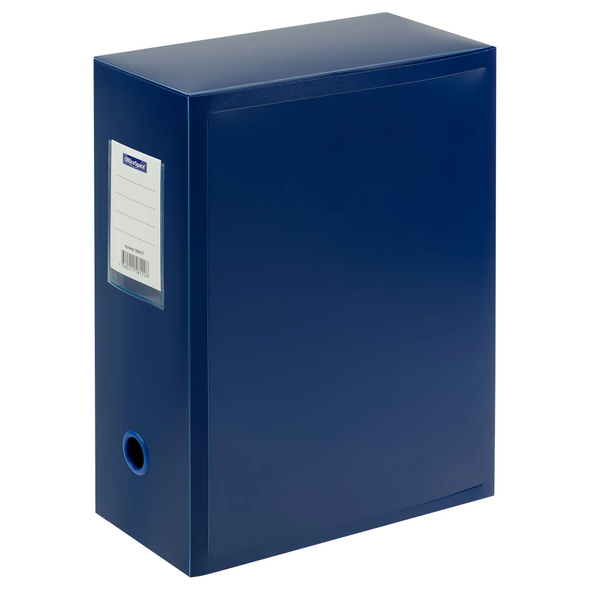 Разборный архивный короб OfficeSpace предназначен для краткосрочного хранения документов и бумаг формата А4. Имеется наварной карман со сменным информационным ярлыком для маркировки. Короб закрывается на кнопку. На корешке предусмотрено кольцо для удобства захвата. Ширина — 120 мм. Короб изготовлен из полипропилена синего цвета толщиной 0,9 мм.