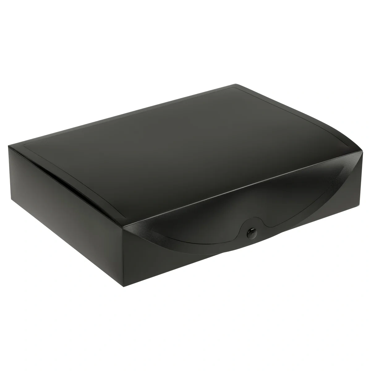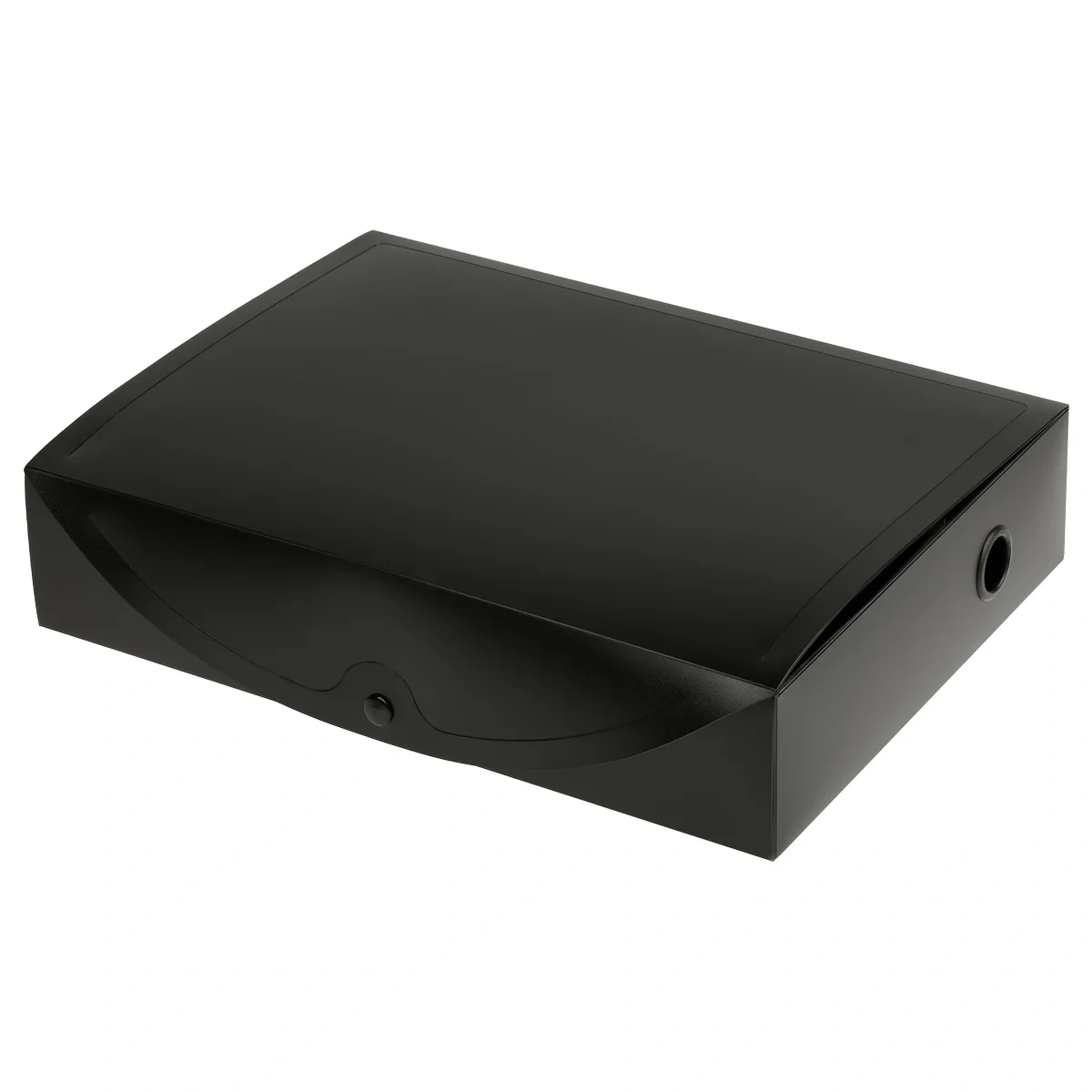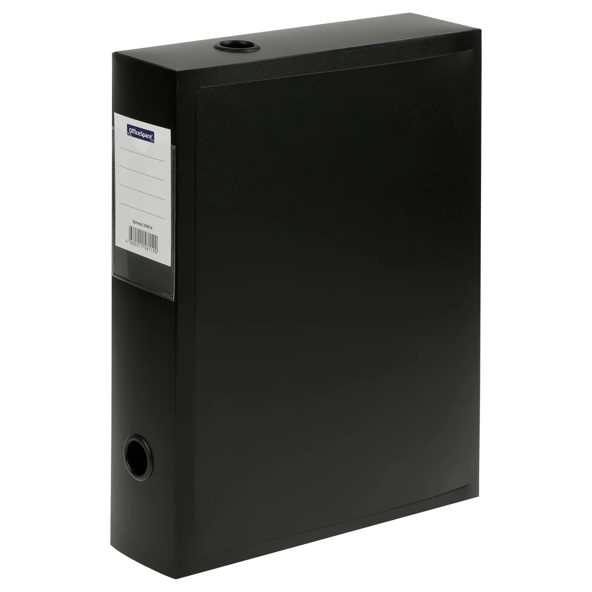 Разборный архивный короб OfficeSpace предназначен для краткосрочного хранения документов и бумаг формата А4. Имеется наварной карман со сменным информационным ярлыком для маркировки. Короб закрывается на кнопку. На корешке предусмотрено кольцо для удобства захвата. Ширина — 70 мм. Короб изготовлен из полипропилена чёрного цвета толщиной 0,9 мм.