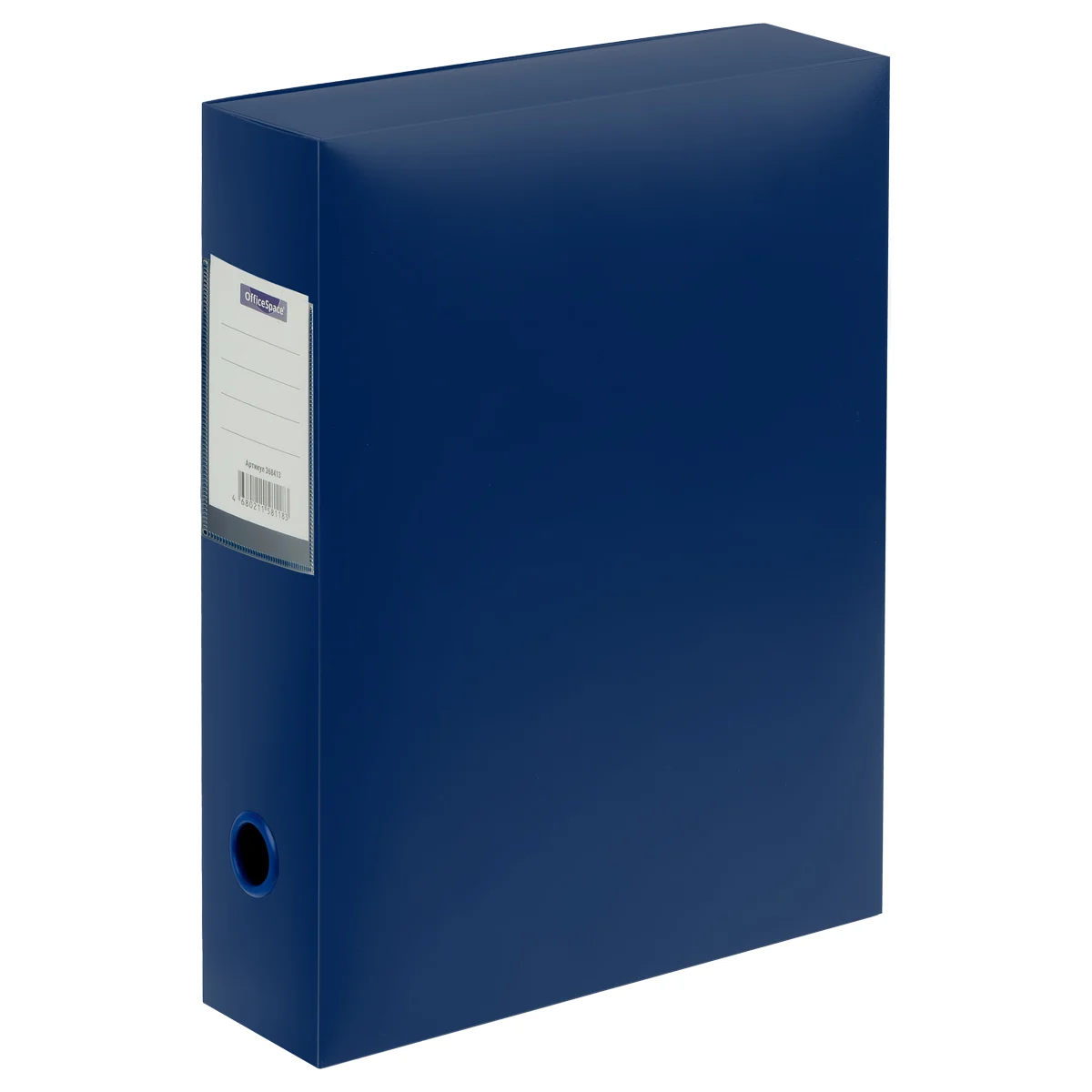 Разборный архивный короб OfficeSpace предназначен для краткосрочного хранения документов и бумаг формата А4. Имеется наварной карман со сменным информационным ярлыком для маркировки. Короб закрывается на кнопку. На корешке предусмотрено кольцо для удобства захвата. Ширина — 70 мм. Короб изготовлен из полипропилена синего цвета толщиной 0,9 мм.