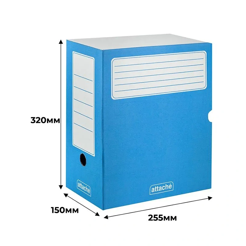 Ширина корешка — 150 мм. Короб архивный Attache вмещает до 1500 листов стандартной плотности. Внешний размер изделия — 255×320×150 мм, внутренний размер изделия — 253×318×100 мм. Поставляется в разобранном виде. В упаковке — 5 штук.