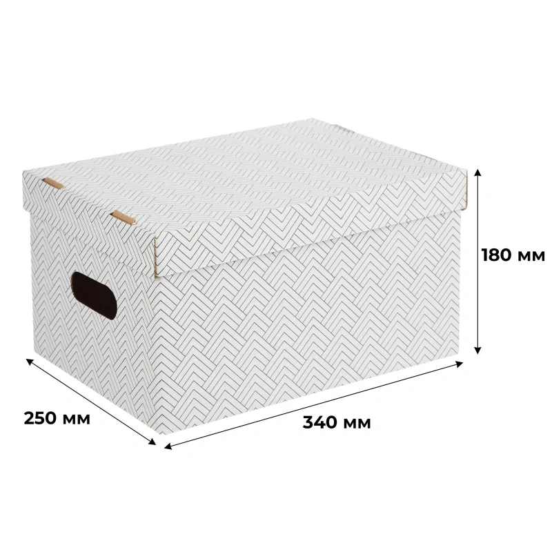 Короб с крышкой для хранения предназначен для архивации, хранения, перевозки документов, игрушек, тетрадей, вещей и прочих сухих предметов. Внешние размеры 340×250×180 мм. Внутренние размеры 324×244×180 мм. Материал короба — микрогофрокартон. Цвет — белый.