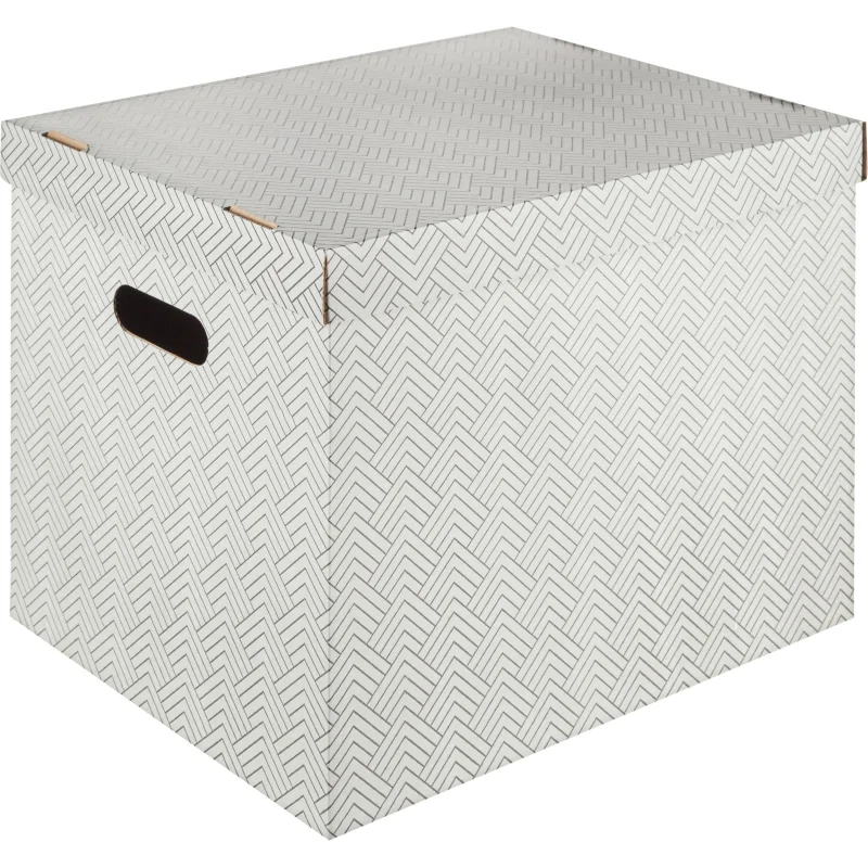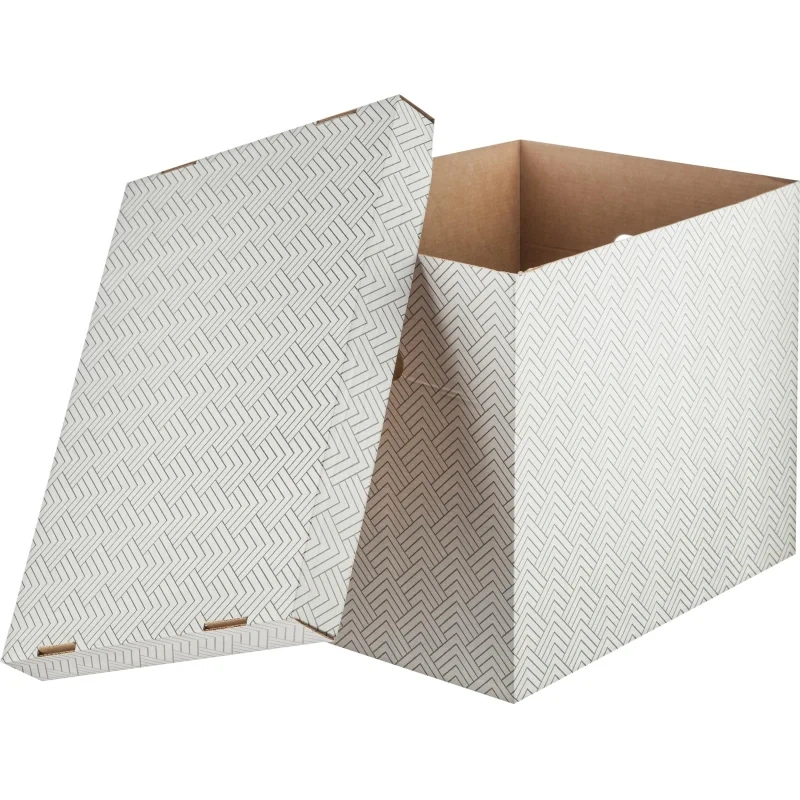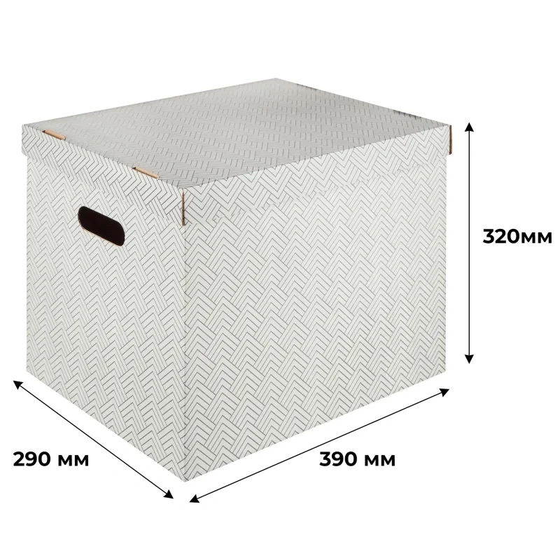 Короб с крышкой для хранения предназначен для архивации, хранения, перевозки документов, игрушек, тетрадей, вещей и прочих сухих предметов. Внешние размеры 390×290×320 мм. Внутренние размеры 374×284×320 мм. Материал короба — микрогофрокартон. Цвет — серый.