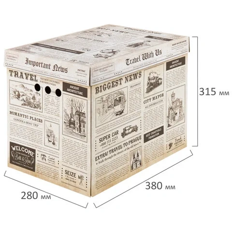 Короб отлично держит форму, а для удобства перемещения на боковых сторонах имеются декоративные отверстия. Разноцветный рисунок в виде газетной темы не позволит коробам затеряться на полках и стеллажах в вашей квартире или офисе.