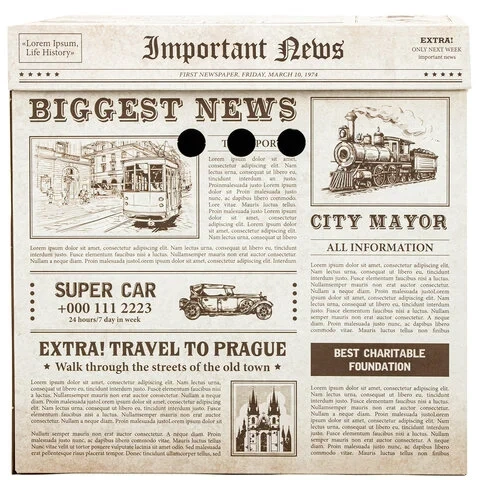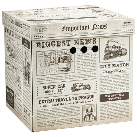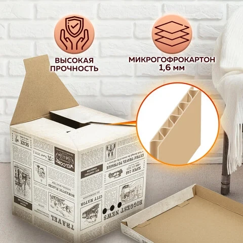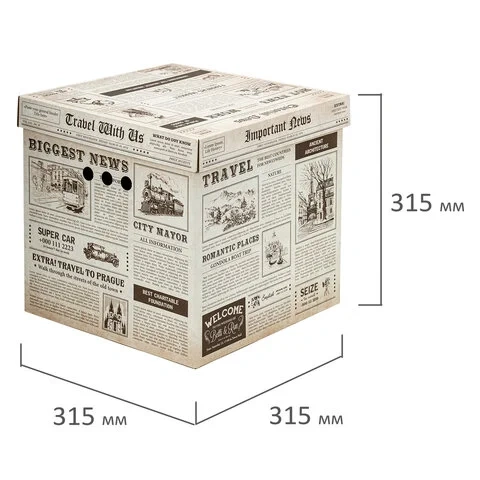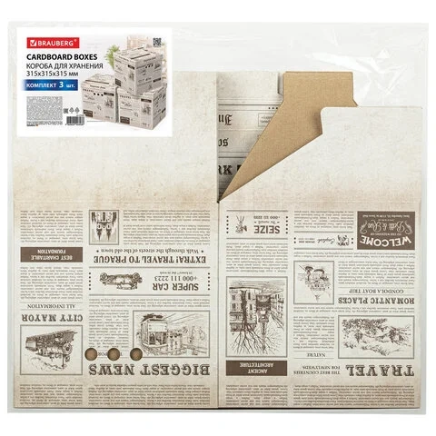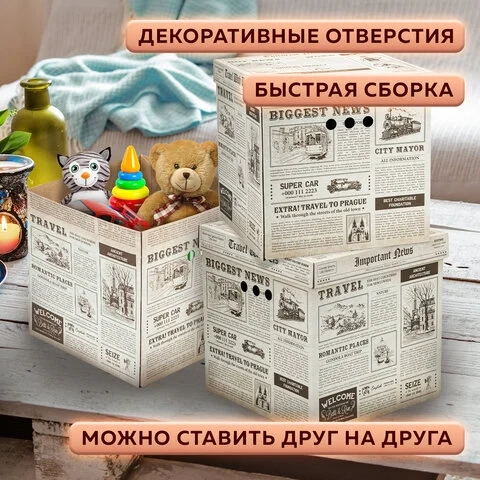В комплект входят 3 короба размером 31,5 х 31,5 х 31,5 см со съемными крышками, изготовленные из плотного экологичного микрогофрокартона толщиной 1,6мм. Короб отлично держит форму, а для удобства перемещения на боковых сторонах имеются декоративные отверстия. Разноцветный рисунок в виде газетной темы не позволит коробам затеряться на полках и стеллажах в вашей квартире или офисе. Для обеспечения сохранности поставляются в разобранном виде. Пошаговую схему сборки можно найти на обратной стороне вкладыша.
