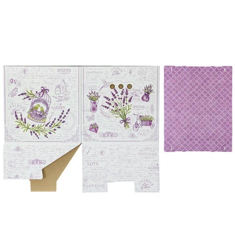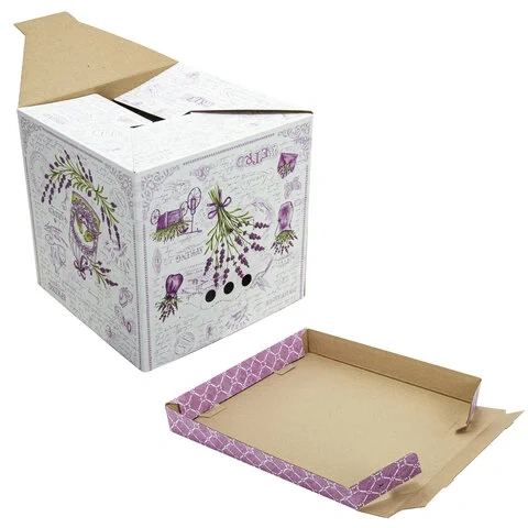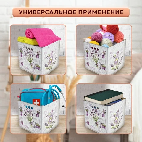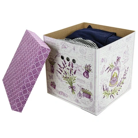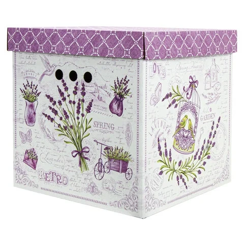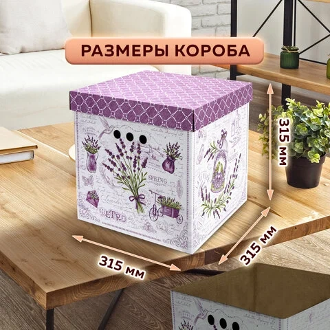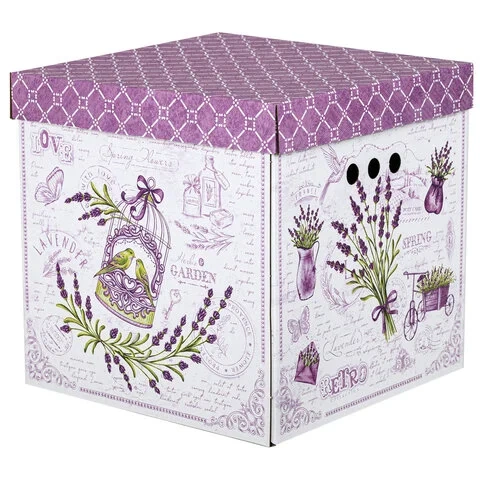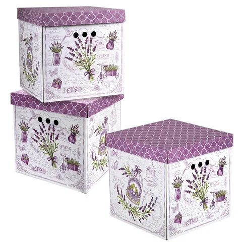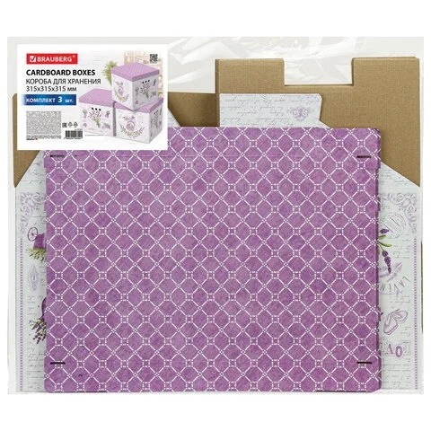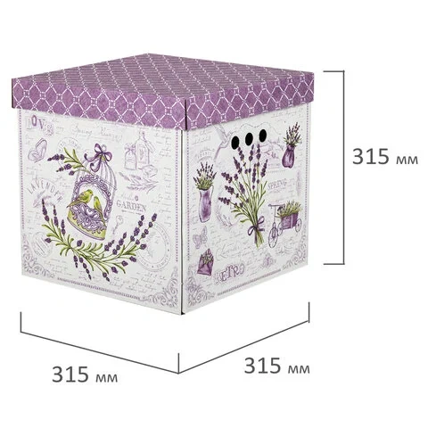 В комплект входят 3 короба размером 31,5х31,5х31,5 см со съемными крышками, изготовленные из плотного экологичного микрогофрокартона толщиной 1,6 мм. Короб отлично держит форму, а для удобства перемещения на боковых сторонах имеются круглые отверстия. Разноцветный рисунок в виде лавандовой темы не позволит коробам затеряться на полках и стеллажах в вашей квартире или офисе. Для обеспечения сохранности поставляются в разобранном виде. Пошаговую схему сборки можно найти на обратной стороне вкладыша.
