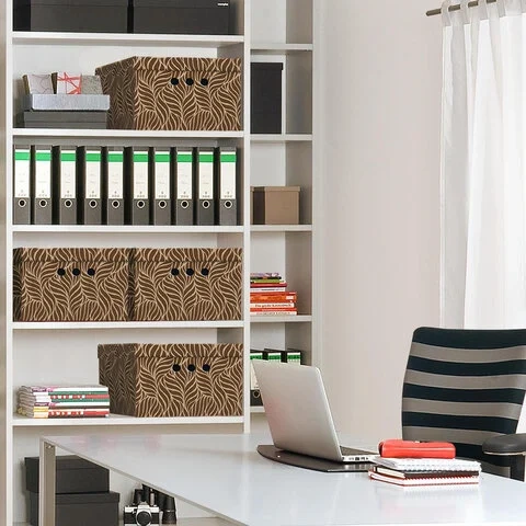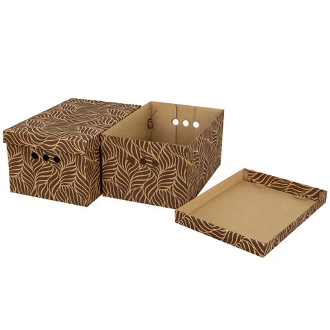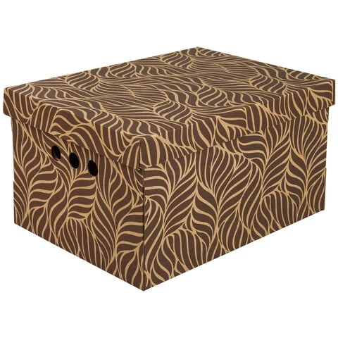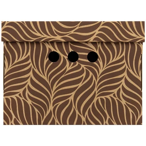 Короб отлично держит форму, а для удобства перемещения на боковых сторонах имеются декоративные отверстия. Рисунок в виде узора не позволит коробам затеряться на полках и стеллажах в вашей квартире или офисе.