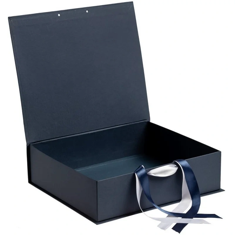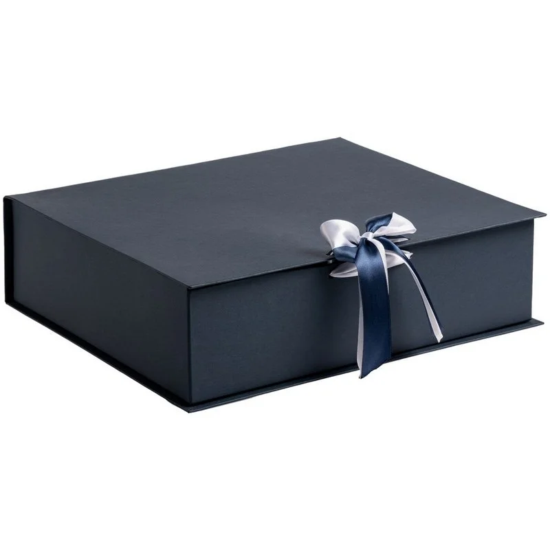 Коробка выполнена из переплетного картона, кашированного дизайнерской бумагой Efalin, с крышкой на лентах.Допустимо незначительное отхождение внутреннего короба по линии склейки. Претензии к товару по этой причине не принимаются. Материал: переплетный картон Размер: 36,5x31,2x10,2 см; внутренние размеры: 34,5x29,8x9,4 см Цвет: синий
