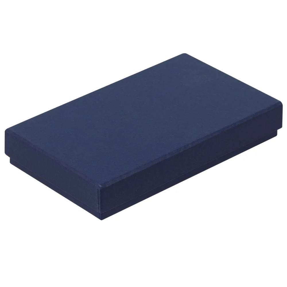 Коробка выполнена из переплетного картона, кашированного дизайнерской бумагой Malmero Bleu. Для нанесения логотипа методом шелкографии на темные коробки рекомендуем использовать белый, золотистый и серебристый цвета во избежание проявления оттенка основы. Цвет - синий. Размер: 17,2х10,3х2,9 см. Материал: переплетный картон. Возможные виды нанесения: Наклейка; Шелкография (1 цвет)