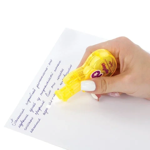 Корректирующая лента представляет собой сухой состав, который заключен в оригинальный и эргономичный корпус. Она позволяет за считаные секунды исправить желаемый участок текста. Не крошится при письме по исправленному фрагменту. Удобна в использовании правой и левой рукой. Исправления не заметны на ксеро- и факс-копиях. Общая длина корректирующей ленты — 6 м, ширина — 5 мм. Цвет корпуса - желтый. Упаковка - блистер с европодвесом.