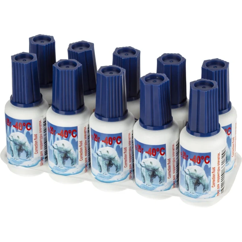 Корректирующая жидкость применяется для корректировки всех типов документов, включая бумагу для факсов. Ложится ровным гладким слоем, создает непрозрачное покрытие. Имеет водную (эмульсионную) основу. Температура при транспортировке — до — 40 градусов Цельсия. Вид кисточки — ворс. Объем флакона с корректирующей жидкостью составляет 20 мл.