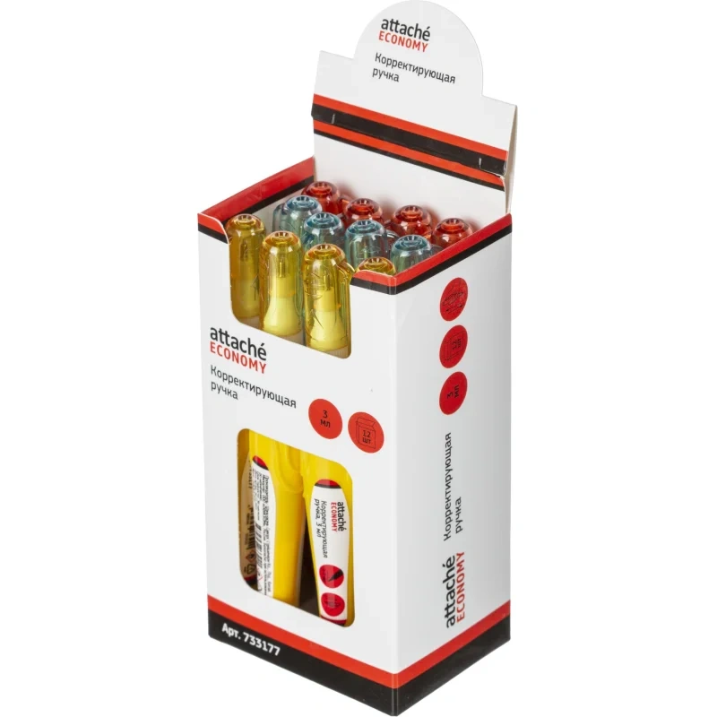 Корректирующий карандаш Attache Economy предназначен для точечных исправлений на любых типах бумаги. Данный вид корректировки особенно удобен, если Вам нужно исправить небольшой объем текста или даже самую маленькую помарку. Идеально подходит для студентов и старших школьников. Объем флакона - 3 мл. Металлический наконечник позволяет наносить тонкие линии. Содержит быстросохнущую основу, обладает высокой кроющей способностью. 1. Перед применением тщательно встряхните средство в течение не менее 10 секунд, затем снимите колпачок. 2. Прижмите наконечник ручки к поверхности бумаги. 3. Нажмите на корпус ручки для подачи корректирующего средства и равномерно нанесите его на бумагу. 4. После применения плотно закройте колпачок. Внимание! Товар поставляется в нескольких вариантах дизайна/цвета корпуса (без возможности выбора).