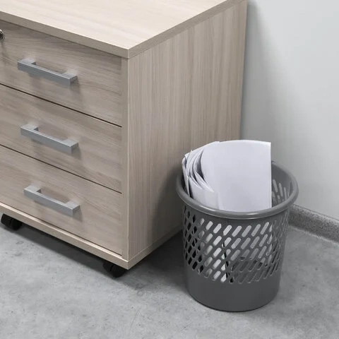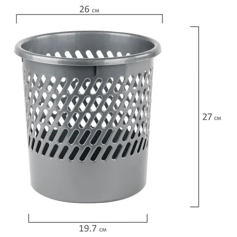 Изготовлена из высококачественного пластика серого цвета. Корпус расширяется к верху: диаметр основания составляет 19,7 см, а диаметр верхней части – 26 см. Высота – 27 см, объем – 10 л. Легкость и компактность корзины позволяют перемещать ее с одного места на другое. Изделие удобно помещается под рабочим столом. Рекомендуемый размер мешка для мусора – 45х56 см, объем – до 18 литров.