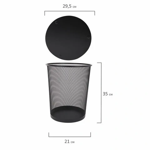 Изготовлена из металлической сетки черного цвета. Благодаря объему 20 литров способна вместить большое количество мусора. Корпус расширяется к верху: диаметр основания составляет 21 см, а диаметр верхней части - 29,5 см. Легкость и компактность корзины позволяет перемещать её с одного места на другое. Корзина удобно помещается под рабочим столом. Рекомендуемый размер мешка для мусора - 50х60 см, объем - до 30 литров.