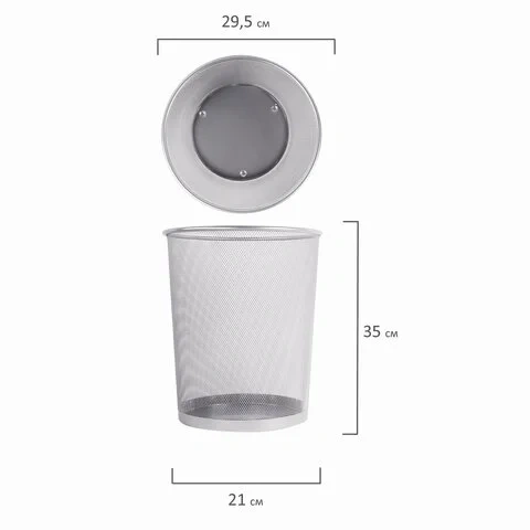 Изготовлена из металлической сетки серебристого цвета. Благодаря объему 20 литров способна вместить большое количество мусора. Корпус расширяется к верху: диаметр основания составляет 21 см, а диаметр верхней части - 29,5 см. Высота - 35 см. Легкость и компактность корзины позволяет перемещать её с одного места на другое. Корзина удобно помещается под рабочим столом. Рекомендуемый размер мешка для мусора - 50х60 см, объем - до 30 литров.