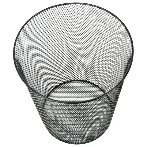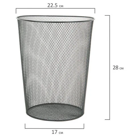Изготовлена из металлической сетки черного цвета. Корпус расширяется к верху: диаметр основания составляет 17 см, а диаметр верхней части -22,5 см. Высота - 28 см, объем - 9 л. Легкость и компактность корзины позволяют перемещать её с одного места на другое. Корзина удобно помещается под рабочим столом. Рекомендуемый размер мешка для мусора - 32х55 см, объем - до 12 литров.