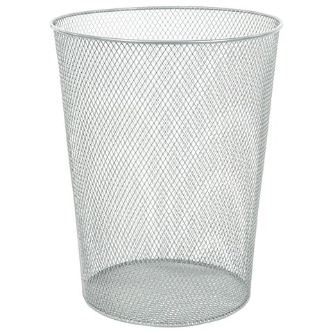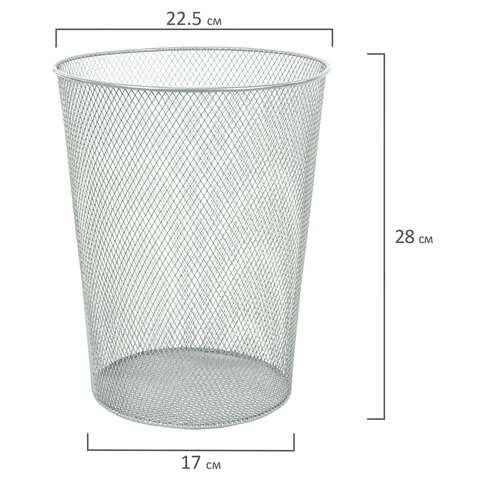 Изготовлена из металлической сетки серебристого цвета. Корпус расширяется к верху: диаметр основания составляет 17 см, а диаметр верхней части -22,5 см. Высота - 28 см, объем - 9 л. Легкость и компактность корзины позволяют перемещать её с одного места на другое. Корзина удобно помещается под рабочим столом. Рекомендуемый размер мешка для мусора - 32х55 см, объем - до 12 литров.