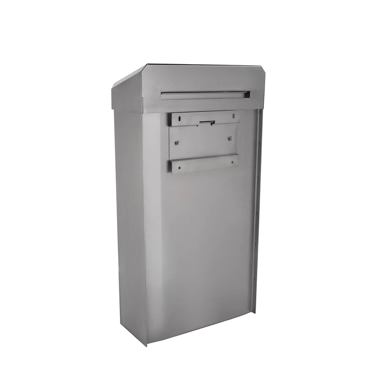 Снабжена прочным стальным барабанным замком заподлицо с поверхностью устройства, сварные соединения боковых стенок зашлифованы, образуя гладкую поверхность.