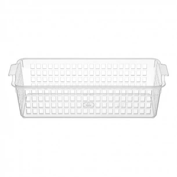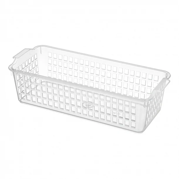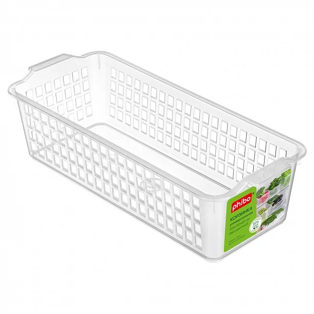 Корзинка универсальная Phibo 31,5 х 13 х 0,85 см подходит для организации хранения на кухне и в холодильнике. Сюда можно положить фрукты, овощи, йогурты, сыры и другие продукты. Высокие стенки корзинки позволят удобно хранить соусы в упаковке дой-пак. Изделие подходит для хранения специй и консервов на полках кухонных шкафов. Благодаря перфорации создается дополнительная вентиляция содержимого. Корзинки легко вкладываются друг в друга в пустом виде для экономии места на кухне. Благодаря боковым ручкам их удобно переносить или снимать с полки.
