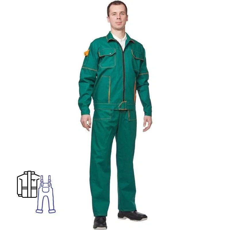 Спецодежда летняя костюм мужской л06-КПК (куртка полукомбинезон). Размер: 44–46. Рост: 182–188. Куртка прямого силуэта с застежкой на 'молнию'. На левом рукаве двухсекционный карман с клапаном Пояс куртки регулируется по ширине застежками-хлястиками Полукомбинезон с застежкой гульфика на пуговицы, с одним нагрудным карманом на клапане и двумя боковыми карманами Ткань: саржа (100% хлопок) Плотность ткани: 240 г/м2. Цвет:темно-бирюзовый , отделка: оранжевый. Сферы применения: сельское хозяйство, логистика, легкая промышленность, строительство, озеленение, автомобильная. Температурный режим стирки — не выше 40 градусов.